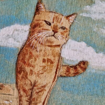 Un chat pensif marche sur un rivage de pierres sableuses, son regard perdu dans l’horizon. Cette illustration capture la solitude et la sérénité d’un moment suspendu, où l’océan rencontre la terre, apportant calme et réflexion à votre intérieur.